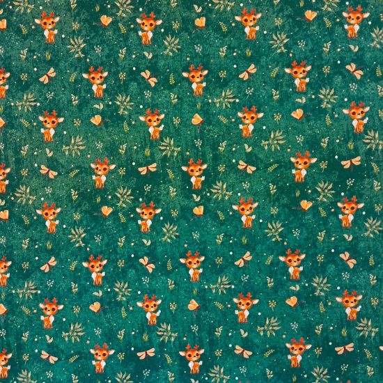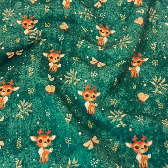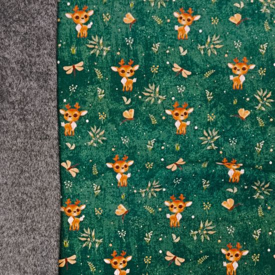 Super kuschelig warmer Alpenfleece in petrol mit süßen Rentierbabys gemustert. Perfekt für den Herbst und Winter, für gemütliche Kleidung wie Hoodies, Jacken, Jogginghosen, Baby- und Kindersachen. Kuschelfaktor: sehr hoch!