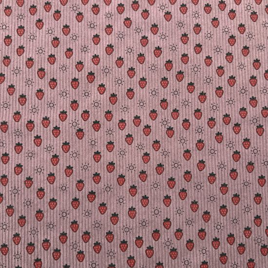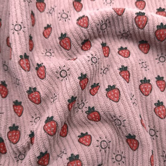 Weicher leicht fallender Cordstoff in jeansblau mit Minierdbeeren gemustert. Perfekt für bequeme Kinderkleidung geeignet, zum Beispiel Latzhosen, Kleider, Röcke, leichte Jacken, Hosen und vieles mehr.