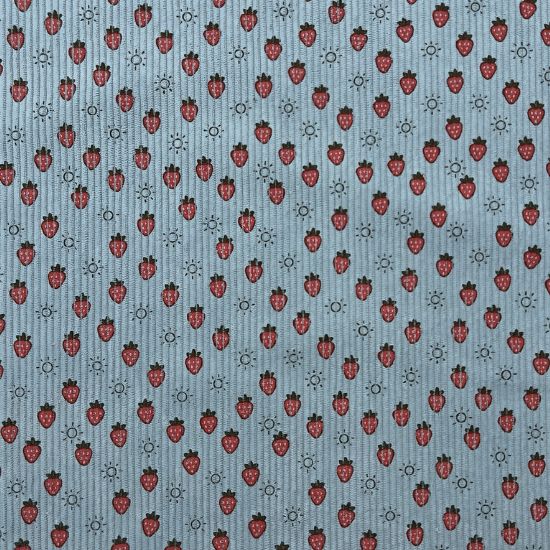 Weicher leicht fallender Cordstoff in jeansblau mit Minierdbeeren gemustert. Perfekt für bequeme Kinderkleidung geeignet, zum Beispiel Latzhosen, Kleider, Röcke, leichte Jacken, Hosen und vieles mehr.