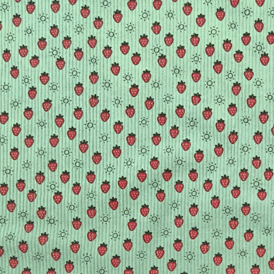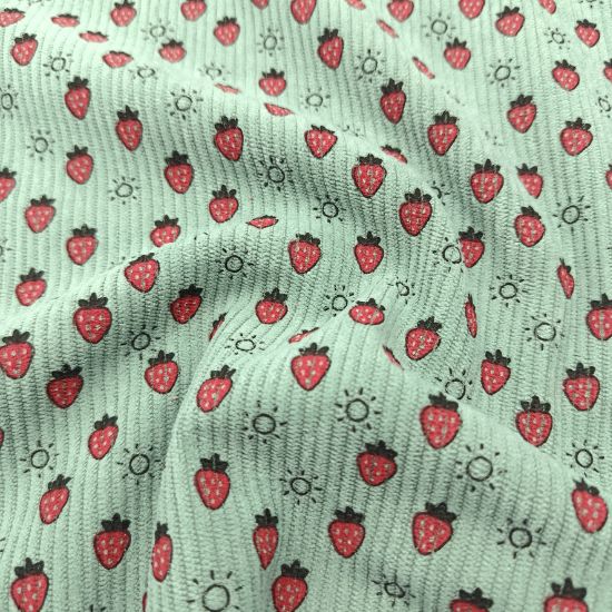 Weicher leicht fallender Cordstoff in mint mit Minierdbeeren gemustert. Perfekt für bequeme Kinderkleidung geeignet, zum Beispiel Latzhosen, Kleider, Röcke, leichte Jacken, Hosen und vieles mehr.