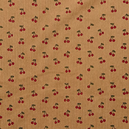 Weicher leicht fallender Cordstoff in beige mit Minikirschen gemustert. Perfekt für bequeme Kinderkleidung geeignet, zum Beispiel Latzhosen, Kleider, Röcke, leichte Jacken, Hosen und vieles mehr.