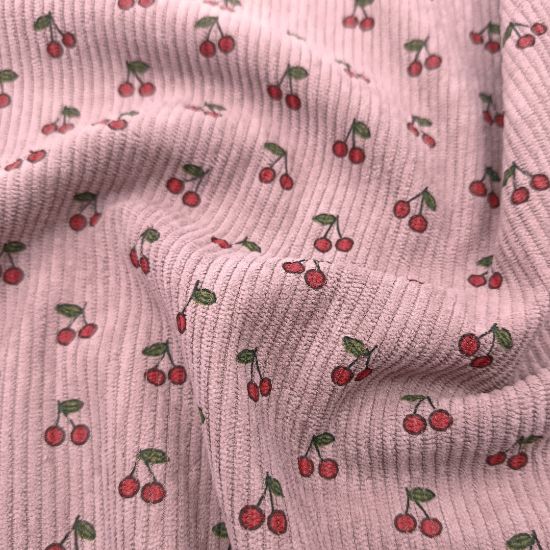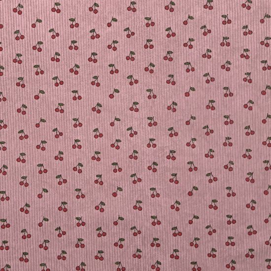 Weicher leicht fallender Cordstoff in dunklem altrosa mit Minikirschen gemustert. Perfekt für bequeme Kinderkleidung geeignet, zum Beispiel Latzhosen, Kleider, Röcke, leichte Jacken, Hosen und vieles mehr.