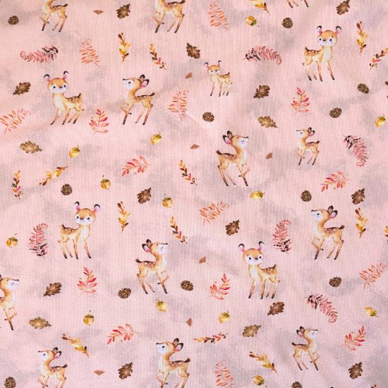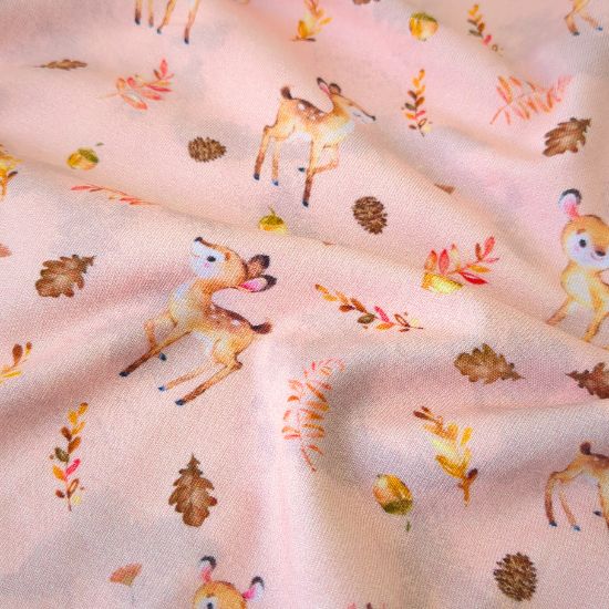 Weicher Baumwolljersey in altrosa mit niedlichen Rehkitzen gemustert. Aus Jersey lassen sich viele tolle Kleidungsstücke für Groß und Klein fertigen, von Kleidern, Shirts und Leggings über Babybodies, Loops und Mützen.