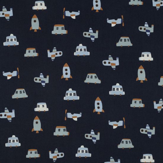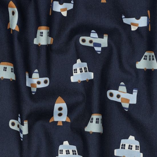 Glatter leicht fallender Baumwollstoff in marineblau mit süßen Fahrzeugen, Flugzeugen und Raketen gemustert. Ideal für Kinderkleidung, Blusen und Hemden. Auch sehr gut verwendbar für Bettwäsche oder für Dekozwecke.