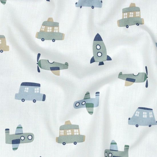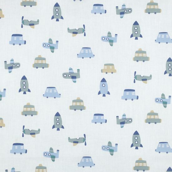 Glatter leicht fallender Baumwollstoff in offwhite mit süßen Fahrzeugen, Flugzeugen und Raketen gemustert. Ideal für Kinderkleidung, Blusen und Hemden. Auch sehr gut verwendbar für Bettwäsche oder für Dekozwecke.
