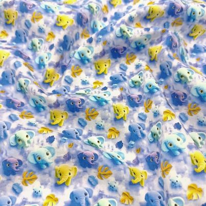 Glatter leicht fallender Baumwollstoff in Flieder Farbtönen mit kleinen bunten Mini Elefanten gemustert. Ideal für Kinderkleidung, Blusen und Hemden. Auch sehr gut verwendbar für Bettwäsche oder für Dekozwecke.