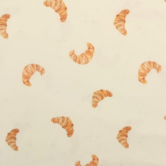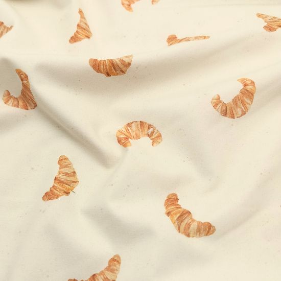 Glatter leicht fallender Baumwollstoff in ecru mit süßen Croissants gemustert. Ideal für den Heimtextilienbereich, wie Schürzen, Geschirrhandtücher, oder Tischdecken. Auch sehr gut verwendbar für Bettwäsche oder bedruckte Polsterstoffe.