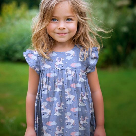 Glatter leicht fallender Baumwollstoff in bleu mit Einhörnern aus Wolken gemustert. Ideal für Kinderkleidung, Blusen und Hemden. Auch sehr gut verwendbar für Bettwäsche oder für Dekozwecke.