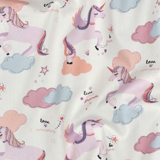 Leicht fallender Baumwollstoff in offwhite mit Einhörnern auf Wolken gemustert