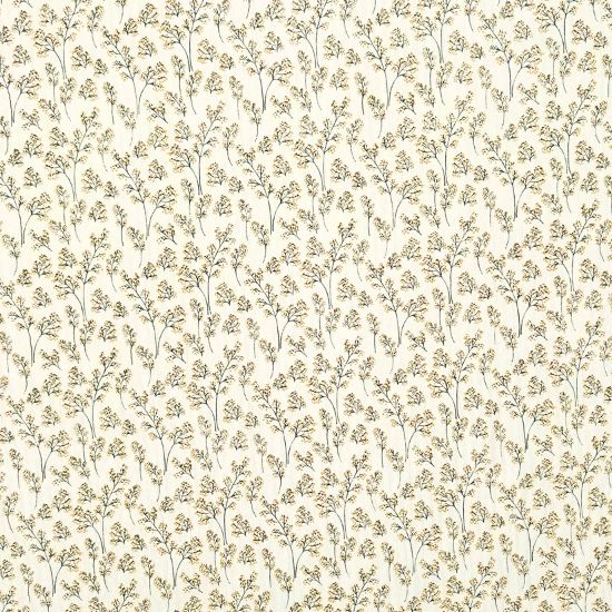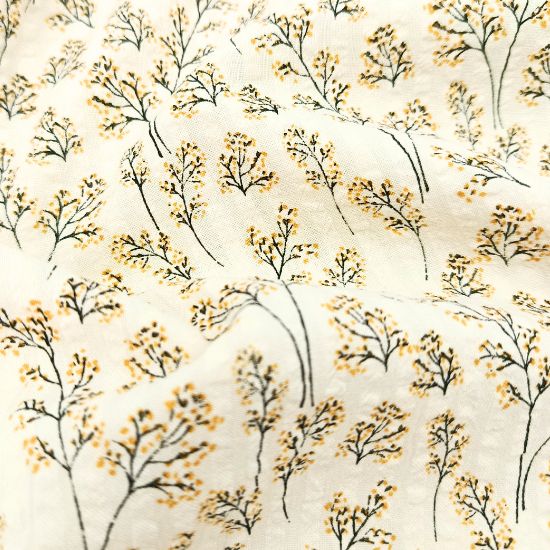 Leichter luftiger Baumwollstoff in strukturierter Seersucker Optik in ecru mit Mini Blütenzweige in Senfgelb gemustert. Ideal für Kinderkleidung, Blusen und Hemden, Kleider und vieles mehr.