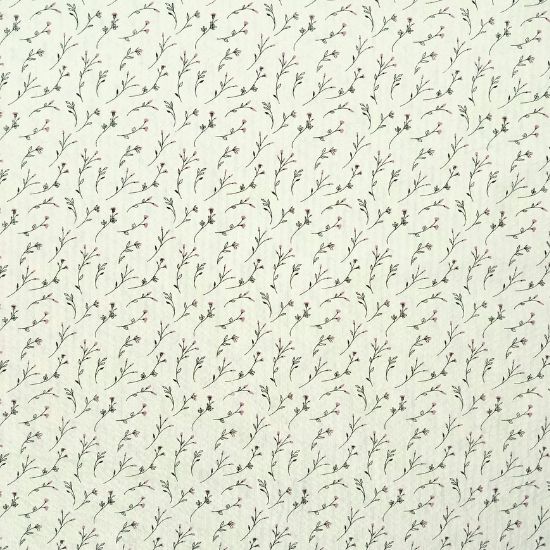 Leichter luftiger Baumwollstoff in strukturierter Seersucker Optik in ecru mit feinen Zweigen in Rosa gemustert. Ideal für Kinderkleidung, Blusen und Hemden, Kleider und vieles mehr.