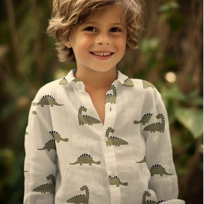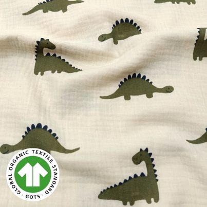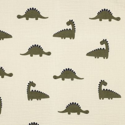 Weicher fallender Bio Musselin in ecru mit kleinen Dinos gemustert.
