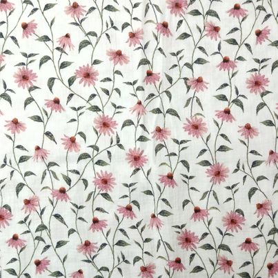 Weicher fallender Bio Musselin in offwhite mit zarten Feldblüten gemustert.