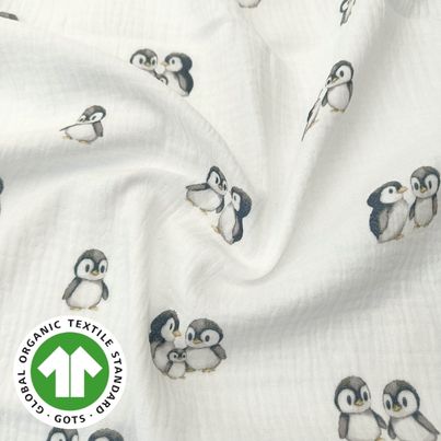 Weicher fallender Bio Musselin in offwhite mit kleinen Pinguinen gemustert.