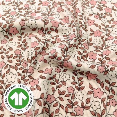 Weicher Ribjersey in Bio- Qualität in zartem ecru mit Miniblüten gemustert. Ein toller Jersey für groß und klein. Ideal für Babykleidung, Kinder-, und Damenshirts.