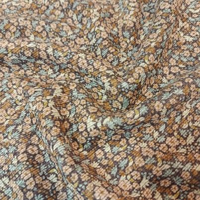 Weicher leicht fallender Cordstoff in braunenFarbtönen mit Allover Mini Blumenprint gemustert. Perfekt für bequeme Kinderkleidung geeignet, zum Beispiel Latzhosen, Kleider, Röcke, leichte Jacken, Hosen und vieles mehr.