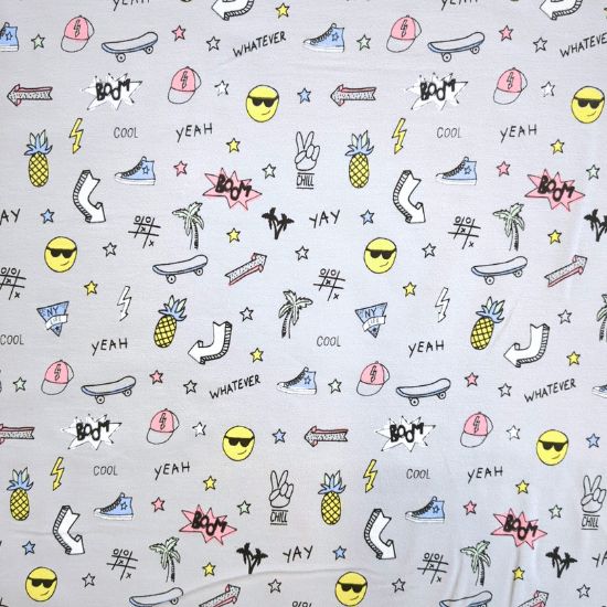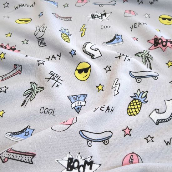 Weicher French Terry in hellgrau mit coolen Motiven Smileys, Skateboard, Text, Ananas, Palmen. Ideal für Baby,- und Kinderkleidung.