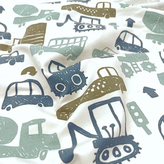Weicher French Terry in offwhite mit vielen Fahrzeugen gemustert. Daraus lassen sich viele tolle Kleidungsstücke für Groß und Klein fertigen, von Kleidern,
