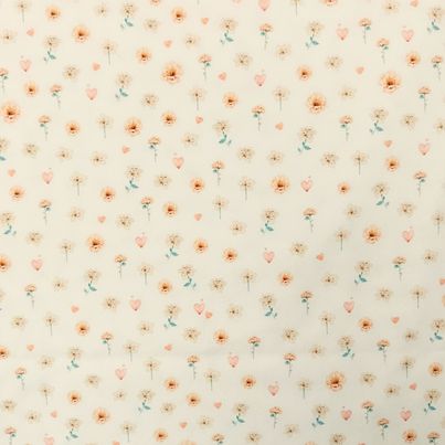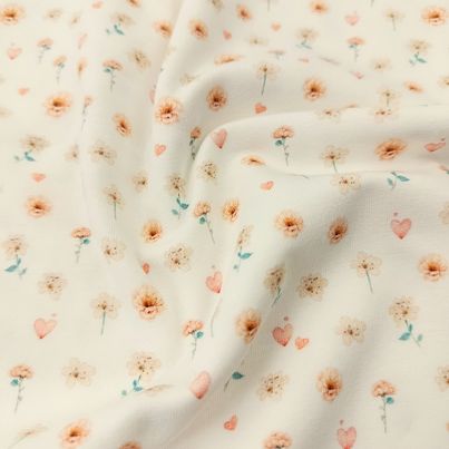 Weicher Baumwolljersey in ecru mit Miniblüten und Herzchen gemustert. Aus Jersey lassen sich viele tolle Kleidungsstücke für Groß und Klein fertigen, von Kleidern, Shirts und Leggings über Babybodies, Loops und Mützen.