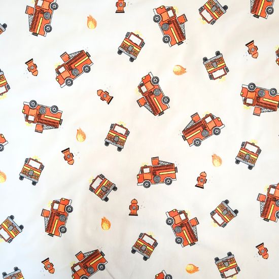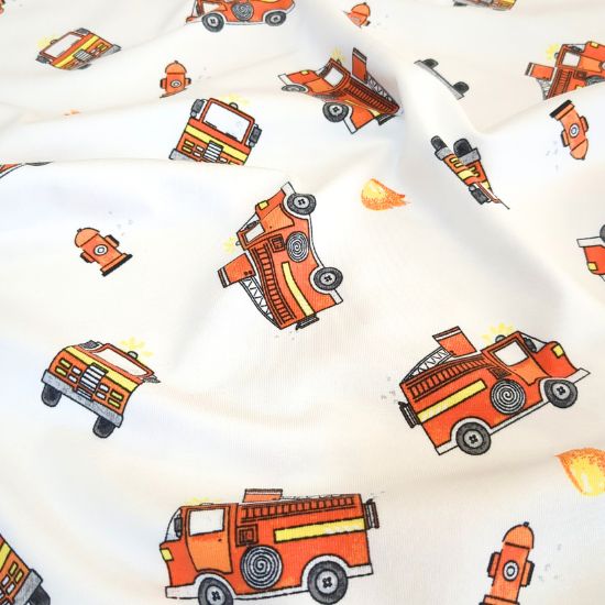Weicher Baumwolljersey in ecru mit Feuerwehrautos gemustert. Aus Jersey lassen sich viele tolle Kleidungsstücke für Groß und Klein fertigen, von Kleidern, Shirts und Leggings über Babybodies, Loops und Mützen.