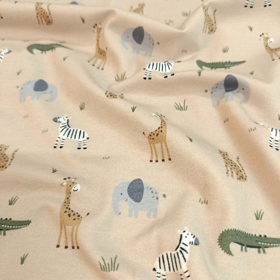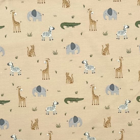 Weicher Baumwolljersey in sand mit Safaritieren gemustert. Aus Jersey lassen sich viele tolle Kleidungsstücke für Groß und Klein fertigen, von Kleidern, Shirts und Leggings über Babybodies, Loops und Mützen.