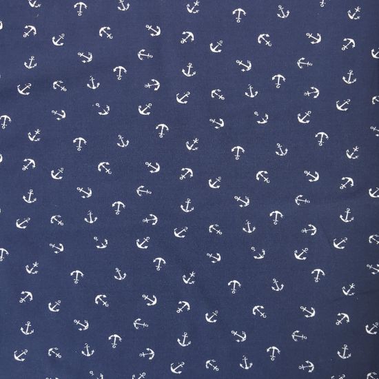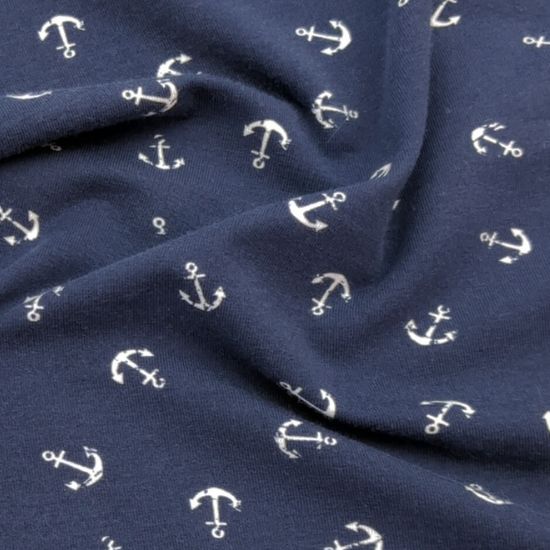 Weicher Baumwolljersey in marine mit kleinen weißen Ankern gemustert. Aus Jersey lassen sich viele tolle Kleidungsstücke für Groß und Klein fertigen, von Kleidern, Shirts und Leggings über Babybodies, Loops und Mützen.