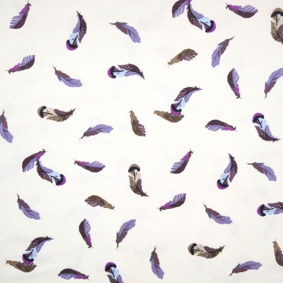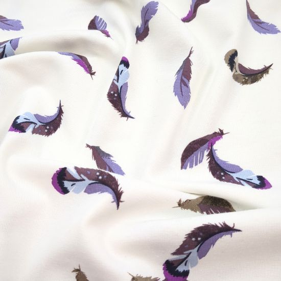 Weicher Baumwolljersey in ecru mit kleinen Federn gemustert. Aus Jersey lassen sich viele tolle Kleidungsstücke für Groß und Klein fertigen, von Kleidern, Shirts und Leggings über Babybodies, Loops und Mützen.