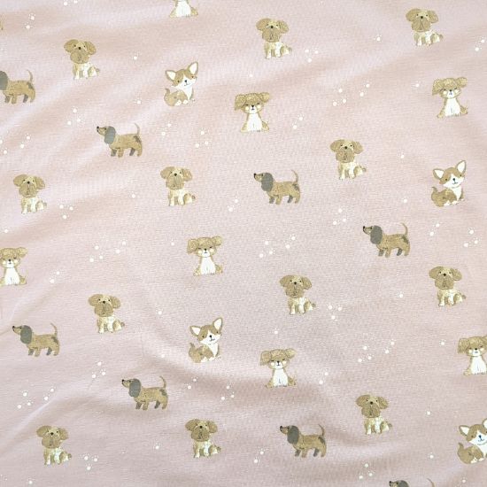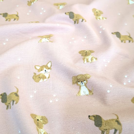 Weicher Baumwolljersey in Altrosa mit kleinen Hunden gemustert. Aus Jersey lassen sich viele tolle Kleidungsstücke für Groß und Klein fertigen, von Kleidern, Shirts und Leggings über Babybodies, Loops und Mützen.