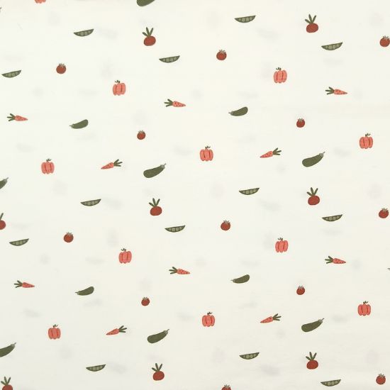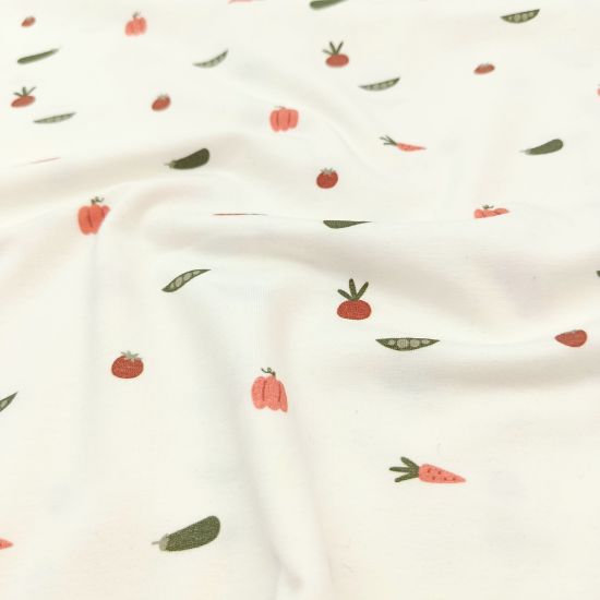 Weicher Baumwolljersey in ecru mit Mini Gemüsesorten gemustert. Aus Jersey lassen sich viele tolle Kleidungsstücke für Groß und Klein fertigen, von Kleidern, Shirts und Leggings über Babybodies, Loops und Mützen.