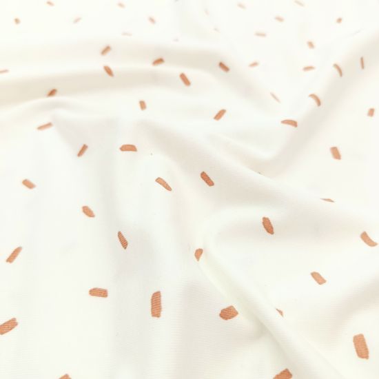 Weicher Baumwolljersey in ecru mit Mini Pinselstrichen gemustert. Aus Jersey lassen sich viele tolle Kleidungsstücke für Groß und Klein fertigen, von Kleidern, Shirts und Leggings über Babybodies, Loops und Mützen.