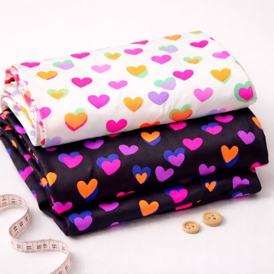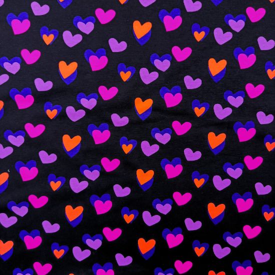 Weicher Baumwolljersey in schwarz mit Neonherzen gemustert. Aus Jersey lassen sich viele tolle Kleidungsstücke für Groß und Klein fertigen, von Kleidern, Shirts und Leggings über Babybodies, Loops und Mützen.