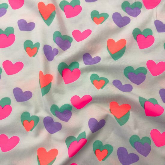Weicher Baumwolljersey in weiß mit Neonherzen gemustert. Aus Jersey lassen sich viele tolle Kleidungsstücke für Groß und Klein fertigen, von Kleidern, Shirts und Leggings über Babybodies, Loops und Mützen.