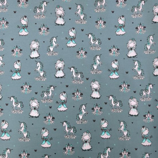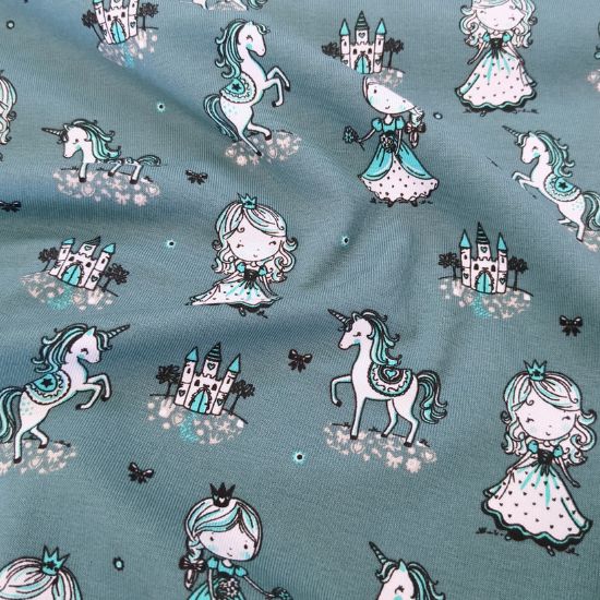 Weicher Baumwolljersey in dunklem Altgrün mit Prinzessinnen und Einhörnern gemustert. Aus Jersey lassen sich viele tolle Kleidungsstücke für Groß und Klein fertigen, von Kleidern, Shirts und Leggings über Babybodies, Loops und Mützen.
