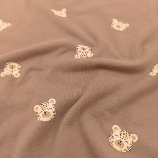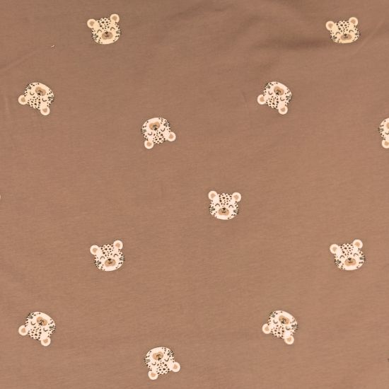 Weicher Baumwolljersey in rehbraun mit Leopardenköpfen gemustert. Aus Jersey lassen sich viele tolle Kleidungsstücke für Groß und Klein fertigen, von Kleidern, Shirts und Leggings über Babybodies, Loops und Mützen.