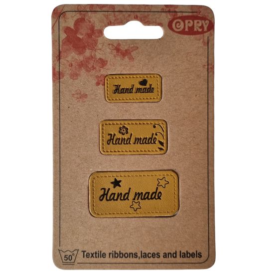 Beschreibung Label aus Lederimitat mit eingraviertem Text in Senfgelb. Verleiht deinen selbstgenähten Werken eine persönliche Note.