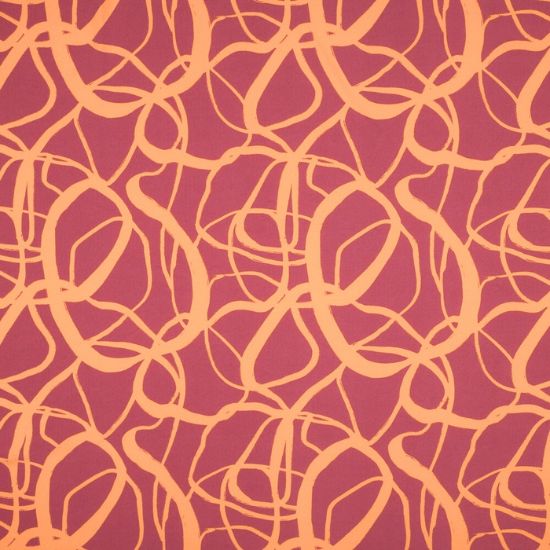 Weichfallender leichter Sommer Stretchstoff in bordeaux mit orangen abstrakten geschwungenen Linien gemustert. Besonders gut geeignet