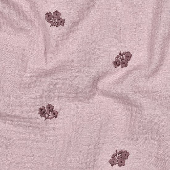 Weicher fallender Musselin in flieder mit gestickten Blüten in mauve gemustert.
