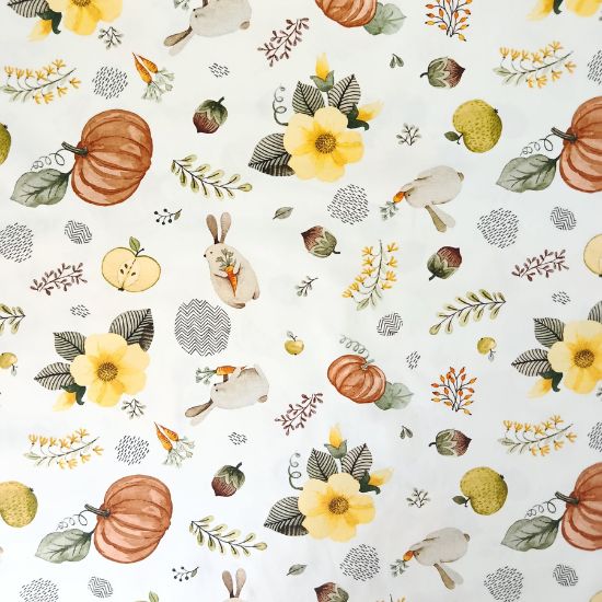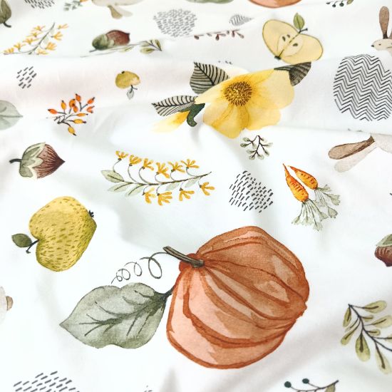 Weicher Baumwolljersey aus dem Hause Swafing in offwhite mit Herbstmotiven gemustert. Aus Jersey lassen sich viele tolle Kleidungsstücke für Groß und Klein fertigen, von Kleidern, Shirts und Leggings über Babybodies, Loops und Mützen.