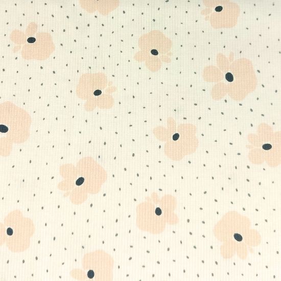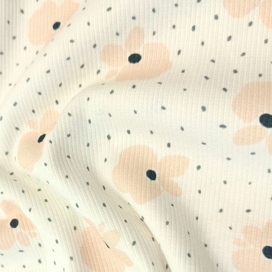 Weicher Ribjersey von Swafing in ecru mit zarten Blüten gemustert. Ein toller Jersey für groß und klein. Ideal für Babykleidung, Kinder-, und Damenshirts.