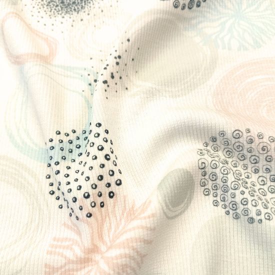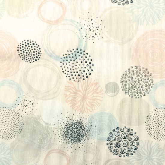 Weicher Ribjersey von Swafing in ecru mit zarten verschiedenen Kreisen gemustert. Ein toller Jersey für groß und klein. Ideal für Babykleidung, Kinder-, und Damenshirts.