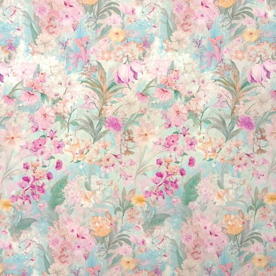Luftig leicht fallende Viskose in Aqua und Rosa-Farbtönen mit sommerlichen Blumen gemustert. Der Stoff ist perfekt geignet für leichte Blusen und