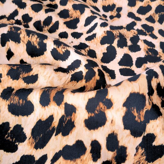 Luftig leicht fallende Viskose in Beige-Tönen mit kleinem Leoprint. Der Stoff ist perfekt geignet für leichte Blusen und