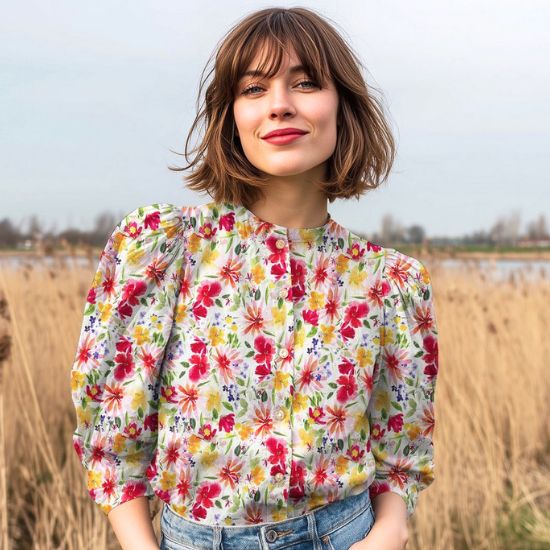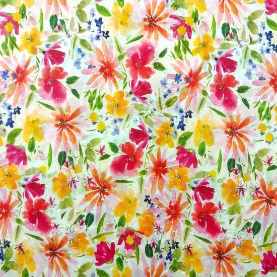 Luftig leicht fallende Viskose in weiß mit bunten Sommer-Blüten gemustert. Der Stoff ist perfekt geignet für leichte Blusen und