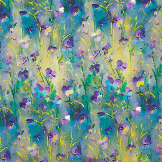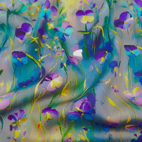 Luftig leicht fallende Viskose in Petroltönen mit Veilchen gemustert. Der Stoff ist perfekt geignet für leichte Blusen und