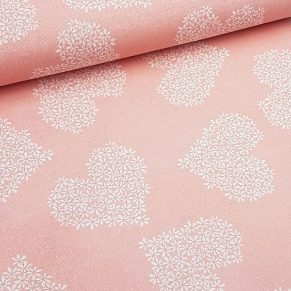 Toller Baumwoll-Popeline in rosa gemustert mit Herzen aus kleinen weißen Blumenblüten, der sich einfach verarbeiten lässt. Ideal für Blusen, Oberteile, Loops, Vorhänge uvm. Lasst Euren Ideen freien Lauf...