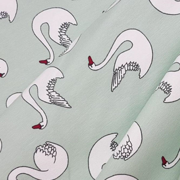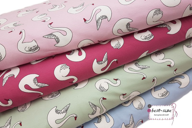 Baumwolljersey ist ein elastischer und weicher Stoff. Er eignet sich für viele Ideen, wie z.B. ausgefallene Shirts, Pumphosen, Beanies, Kleider uvm. Niedlicher Jersey mit Schwänen - der passt zu jeder Jahreszeit :-)