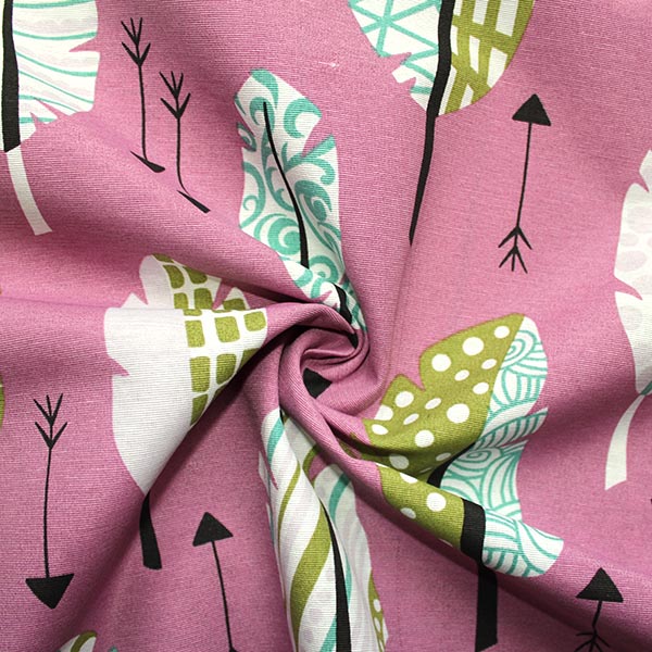 Dekostoff in rosa gemustert mit bunten Indianerfedern und Pfeilen. Der feste Dekostoff eignet sich super für Taschen, Kissen und Polsterbezüge. Lasst Euren Ideen freien Lauf...