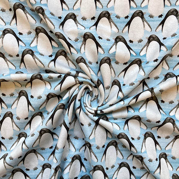 Hochwertiger dünner French Terry/Sommersweat von HILCO in hellblau gemustert mit kleinen Pinguinen.