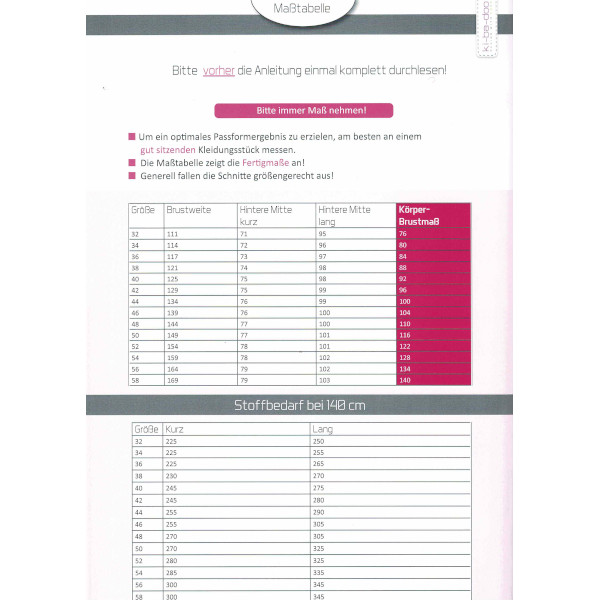 Die Maßtabelle und Angaben zum Stoffverbrauch findest du auf der zweiten Seite.