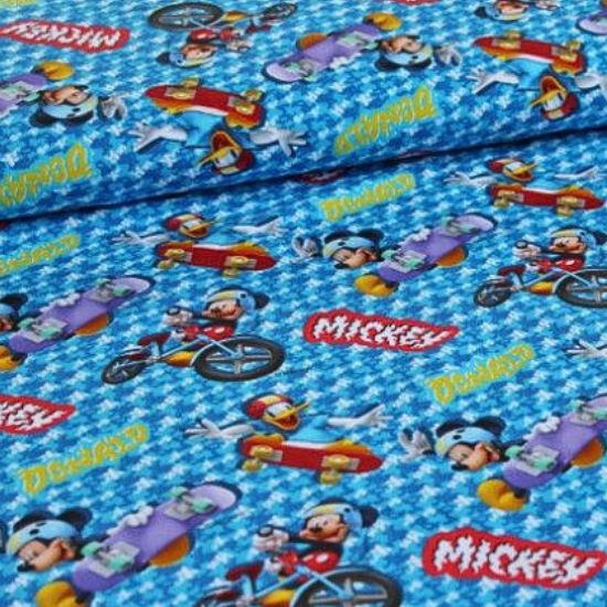 Weicher, leichter und elastischer Stoff in blau gemustert mit Motiven von Mickey Mouse, Donald Duck und weiteren Disneyfiguren, der sich super eignet für dünne Kleidung, Mützen, Schals und vieles mehr.